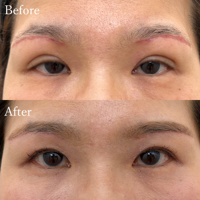 他院でオペを受けてから傷跡が治らず、修正できるクリニックをたくさん探して当院にたどり着いた患者さま。見た目も機能も思い描いていた結果にならず、困っておられました。赤みと凹凸が強く出ていた傷跡の修正を行い経過観察。その後、不自然な幅で留められていた埋没を抜去。修正後の方が目がスッキリ、自然に大きく見えます。