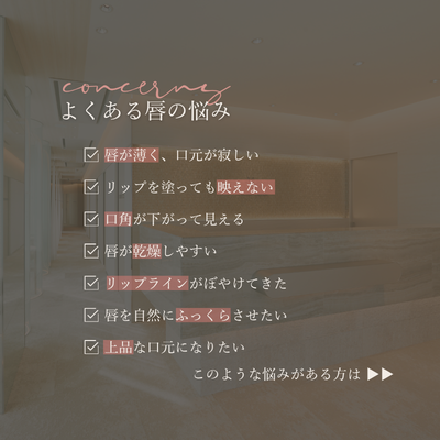 よくある唇の悩み:唇が薄く口元が寂しい、リップを塗っても映えない、口角が下がって見える、唇が乾燥しやすい、リップラインがぼやけてきた、唇を自然にふっくらさせたい、上品な口元になりたい