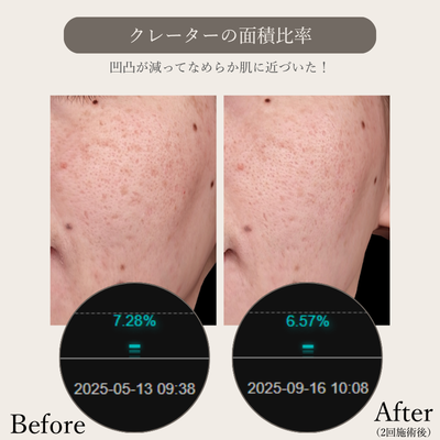 肌を育てるスキンブースターである「ジュベルック」で肌の凹凸を治療。最新のAI搭載肌測定器EveVを使って肌の状態を測定すると、クレーターの面積比率が大幅ダウン!