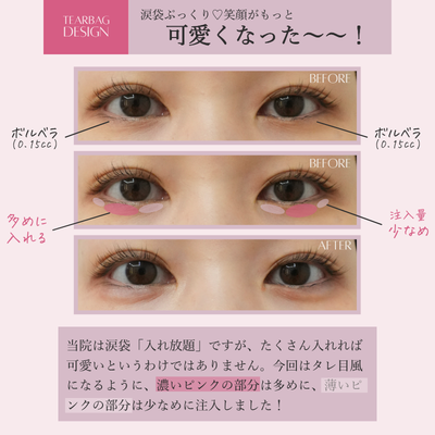 当院は涙袋「入れ放題」ですが、たくさん入れれば可愛いというわけではありません。今回はタレ目風になるように、濃いピンクの部分は多めに、薄いピンクの部分は少なめに注入しました!