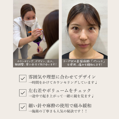 MOMO CLINICの涙袋ヒアルは、目元の状態、お顔全体の雰囲気、患者様の希望をしっかりとチェックしたうえで施術します。カウンセリングにかなりの時間をかけるのでお時間に余裕をもってお越しください。