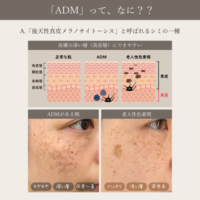 ADMは「後天性真皮メラノサイトーシス」と呼ばれるシミの一種で、真皮層など皮膚の深い層にできやすいです。