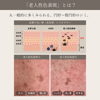 一方で、一般的に多くみられるシミ「老人性色素斑」は、表皮層など皮膚の浅い部分にできやすい特徴があります。