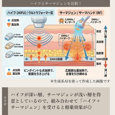 ハイフウルトラフォーマーⅢ(ハイフ治療)、サーマジェンEvo(高周波治療)の違いを解説。同時に行うことで相乗効果が得られます◎