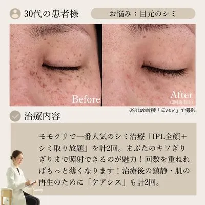 モモクリで一番人気のシミ治療「IPL全顔+シミ取り放題」を計2回。まぶたのキワぎりぎりまで照射できるのが魅力!回数を重ねればもっと薄くなります!治療後の鎮静・肌の再生のために「ケアシス」も計2回。