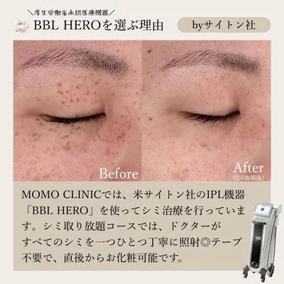 MOMO CLINICでは、米サイトン社のIPL機器「BBL HERO」を使ってシミ治療を行っています。シミ取り放題コースでは、ドクターがすべてのシミを一つひとつ丁寧に照射◎テープ不要で、直後からお化粧可能です。
