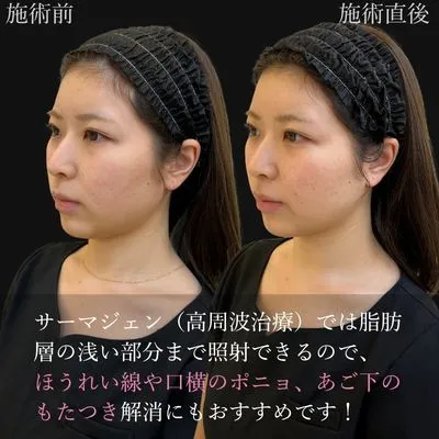サーマジェン(高周波治療)では脂肪層の浅い部分まで照射できるので、ほうれい線や口横のポニョ、あご下のもたつき解消にもおすすめです!