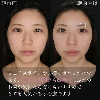 フェイスラインや口横のポニョだけでなく、まぶたの開きも改善◎まぶたのお肉が気になる方にもおすすめでとても人気がある治療です♩