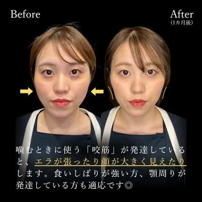 噛むときに使う「咬筋」が発達していると、エラが張ったり顔が大きく見えたりします。食いしばりが強い方、顎周りが発達している方も適応です◎