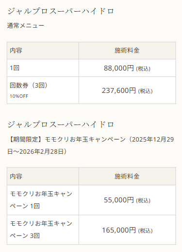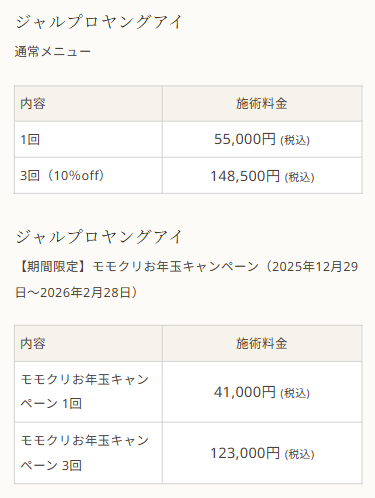 | 注入間隔 | ジャルプロスーパーハイドロ:1カ月に1回を3回 ジャルプロヤングアイ:2週間に1回を3回 |