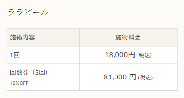 | 施術間隔 | 1カ月に1回のペースで定期的に治療を受けることをおすすめします。 |