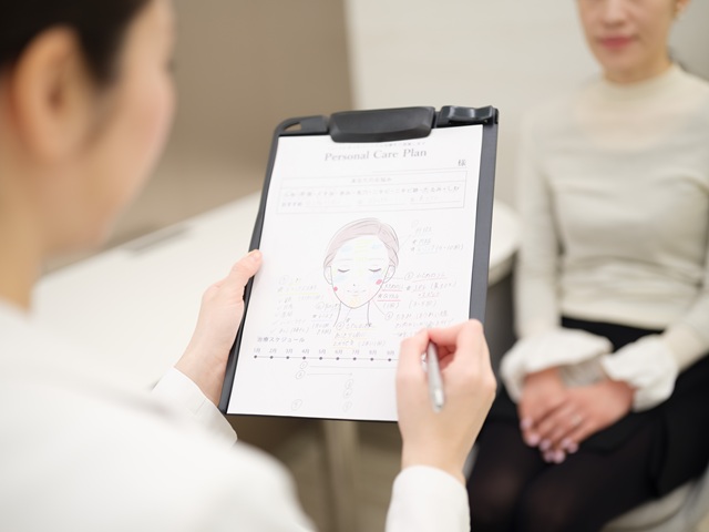 施術の前に必ず施術者によるドクターカウンセリングを行います。今悩んでいること、なりたい印象、具体的な注入量を話し合いながら一緒に決めていきます。注入量が多すぎると「コブダイ」のような不自然な印象になってしまいますし、少なすぎても変化がありません。美しく満足度の高い仕上がりにするために、カウンセリングで徹底的にすり合わせいたします。